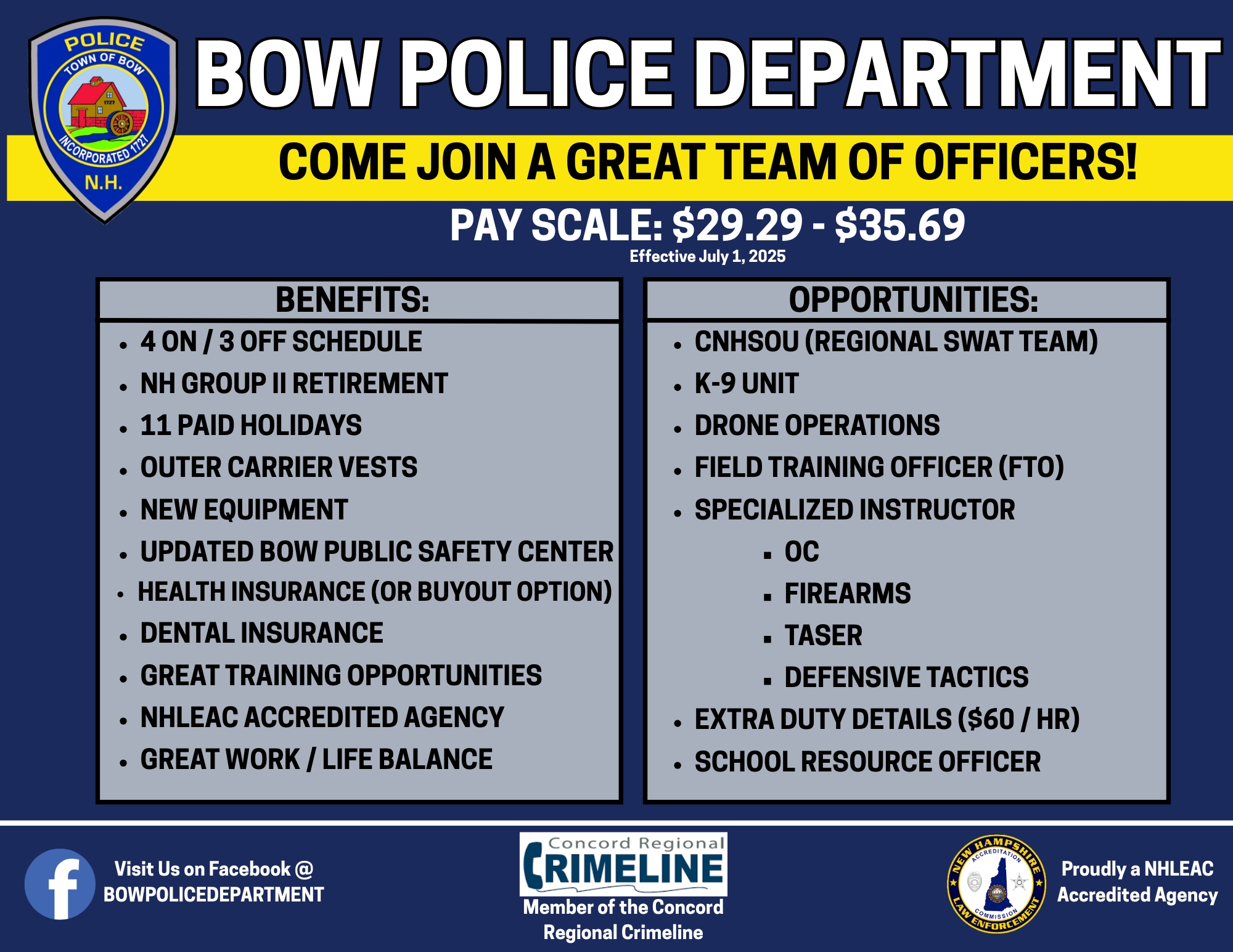 The Bow Police Department is dedicated to providing the highest quality police services to residents of, and visitors to, the Town of Bow. Your compliments and complaints are important to the Bow Police Department, and we appreciate you taking the time to communicate with us.
