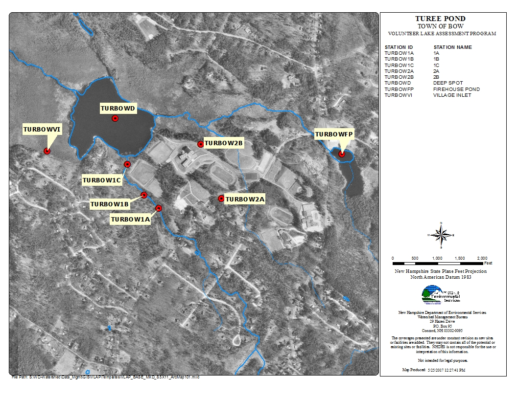 The Bow Conservation Commission continues to be interested in the health of the Turee Pond. We are monitoring the water quality under the Volunteer Lake Assessment Program (VLAP) sponsored by the New Hampshire Department of Environmental Services, and managing the invasive plant, variable milfoil, which was discovered in 2015.