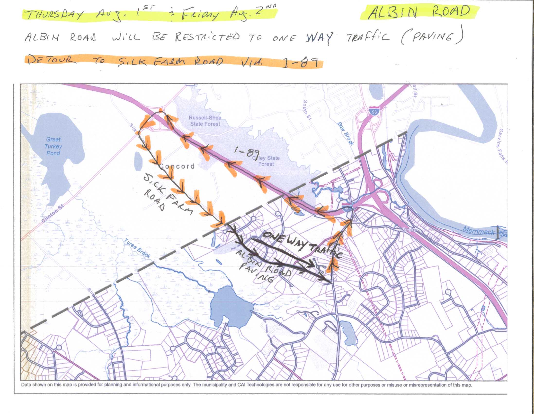 • Albin Road – Paving is scheduled for Friday, August 2nd,   &  Monday,   August 3rd,     ( Traffic will be restricted to One Way Only  )     -    ( Concord Town Line to Logging Hill Road )